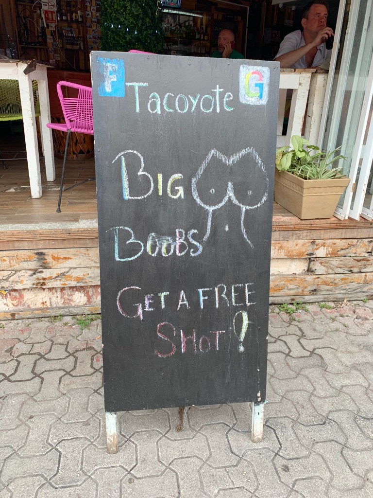 The next day was Boxing Day and we decided to go into Playa Del Carmen for a few hours. The hotel concierge helped arranged a taxi and we were off. We got massages and did a bit of shopping. Of course I had to get this gorgeous gold and white pineapple to add to my collection of pineapple paraphernalia! And we got a kick out of some of the signs outside the bars and restaurants.