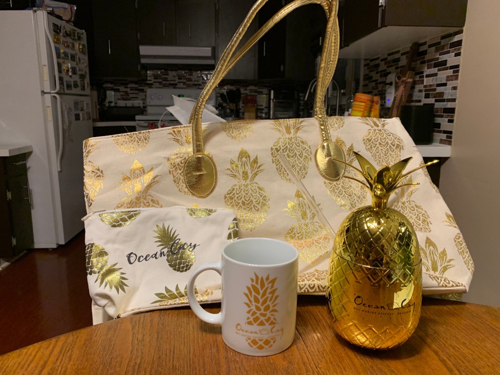 - Beach bag. It’s handy to have a separate bag to take all of the things you need down to the pool or beach. A bag that’s big enough to hold your towels, a couple of bottles of water, a hat, cover up, water shoes, and sunscreen works great! And if it’s got a cute design, even better! I got this beautiful pineapple bag at the cruise port in Belize, but this one is almost identical and around the same price I paid. 🙂