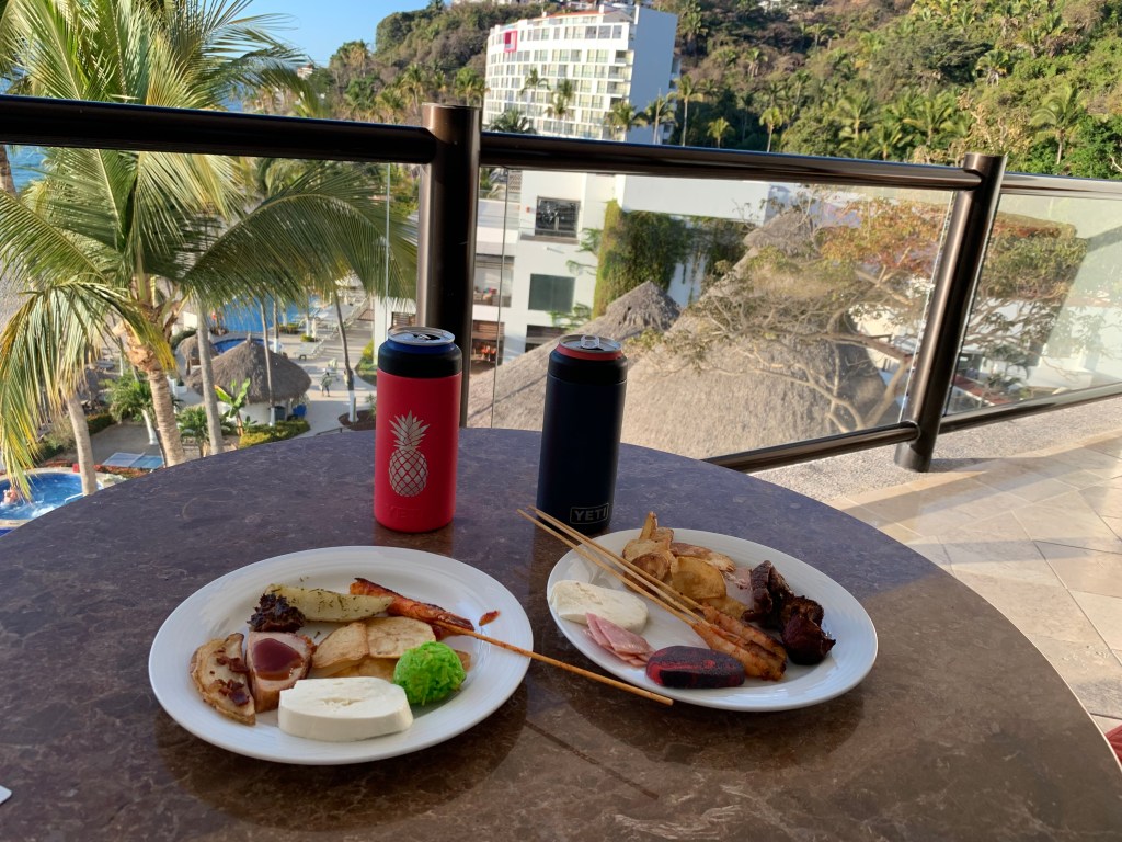 - Yeti or other insulated mug, preferably with a straw. We absolutely love our Yetis. On our last trip, we each brought our YETI Rambler 30 oz Travel Mug and our YETI Rambler Vacuum Insulated Stainless Steel Slim Colster for drinking alcoholic seltzers (see them in action in this pic, eating snacks and drinking seltzers on our balcony). Mine are Bimini Pink (Jerry bought me these two pieces, plus the 14 oz mug and the regular can size Colster last year for my birthday), and Jerry’s are Navy. They really keep your drinks cold while sitting in the sun! Plus most of the resort bartenders will make your drink right in your mug, which means you’ll have a bigger drink and you’ll have to go to the bar less often. Which leads me to my next item…